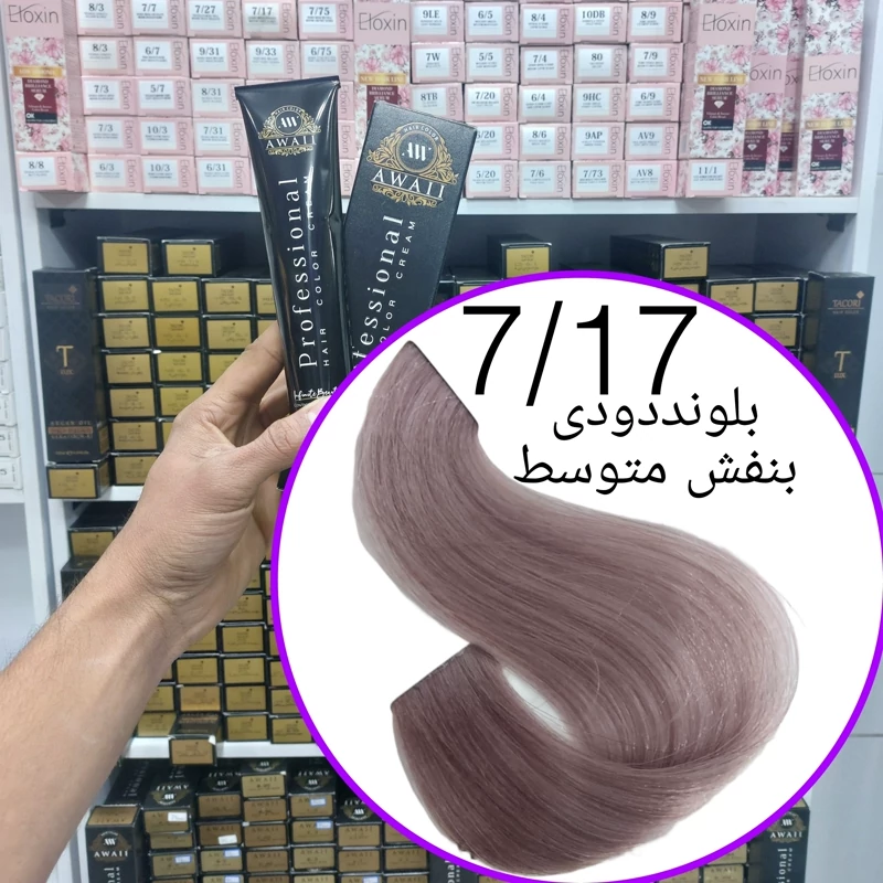 رنگ مو برند آوایی شماره( 7.17)بلوند دودی بنفش متوسط حجم120میل حاوی کراتین و آرگان.ئاوایی.اوایی