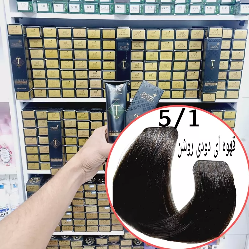 رنگ مو برندتاکوری قهوه ای دودی روشن(5.1)حجم125میل حاوی شی باتر آرگان وکراتین