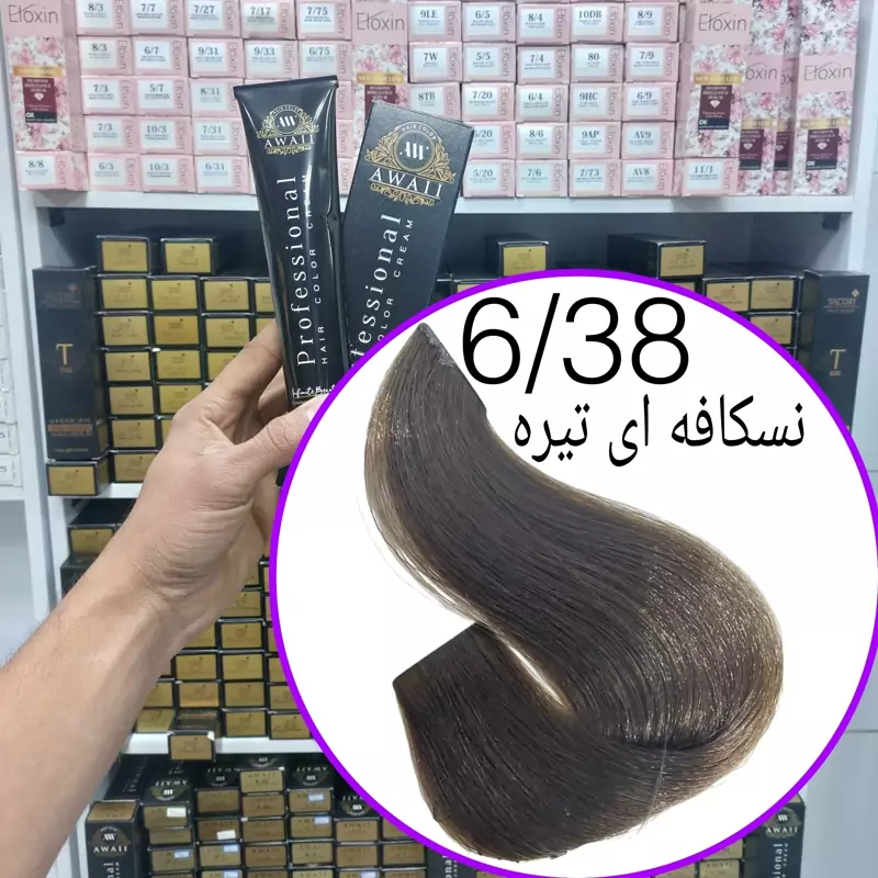 رنگ مو برند آوایی شماره(6.38)نسکافه ای تیره حجم120میل حاوی کراتین و آرگان.ئاوایی.اوایی