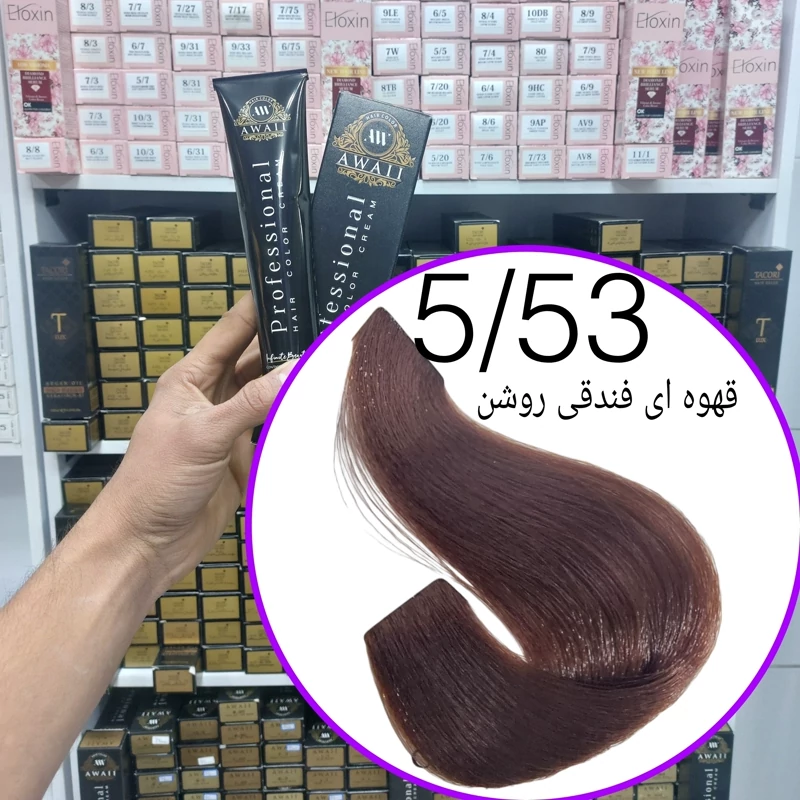 رنگ مو برند آوایی شماره(5.53) قهوه ای فندقی روشن حجم120میل حاوی کراتین و آرگان.ئاوایی.اوایی