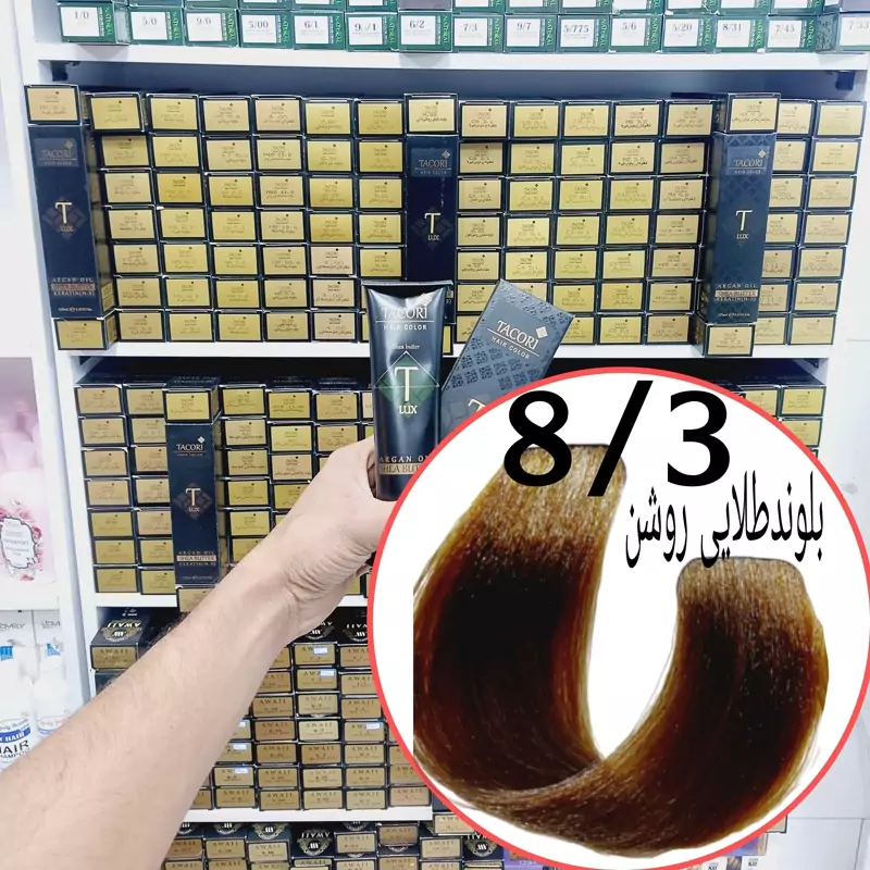 رنگ مو برندتاکوری بلوند طلایی روشن(8.3) حجم125میل حاوی کراتین و آرگان و شی باتر