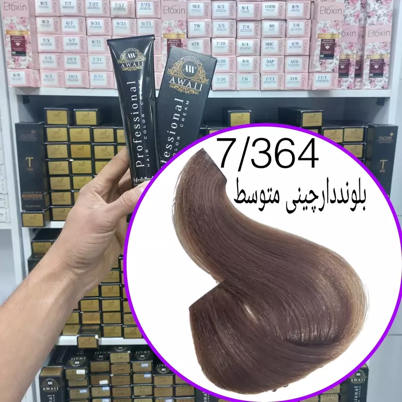 رنگ مو برند آوایی شماره(7.364)بلوند دارچینی متوسط حجم120میل حاوی کراتین و آرگان.ئاوایی.اوایی