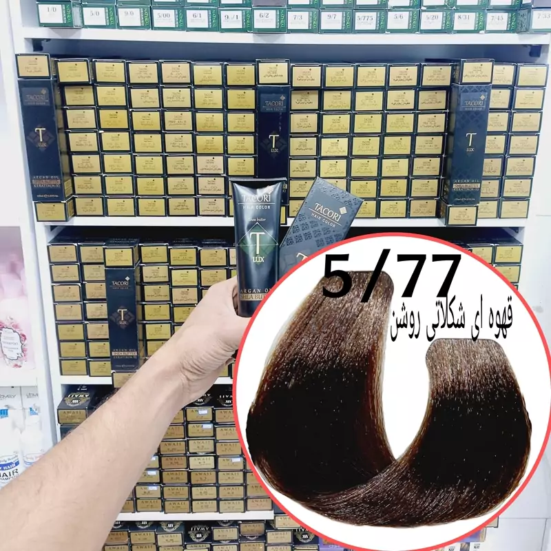 رنگ مو برندتاکوری قهوه ای شکلاتی روشن (5.77) حجم125میل حاوی کراتین و آرگان و شی باتر