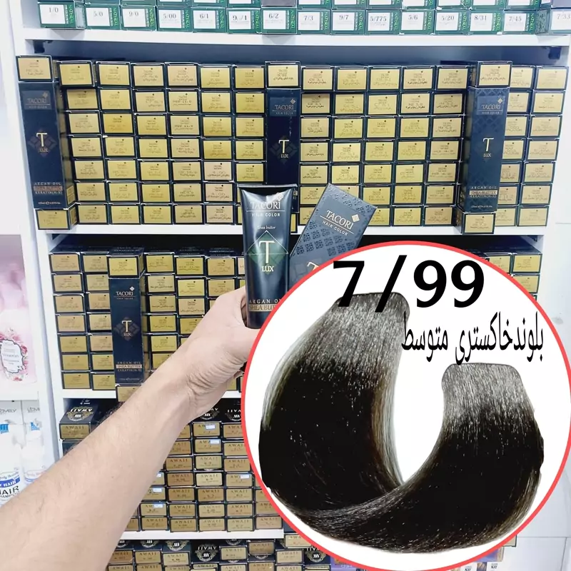 رنگ مو برندتاکوری بلوند خاکستری متوسط(7.99) حجم125میل حاوی کراتین و آرگان و شی باتر