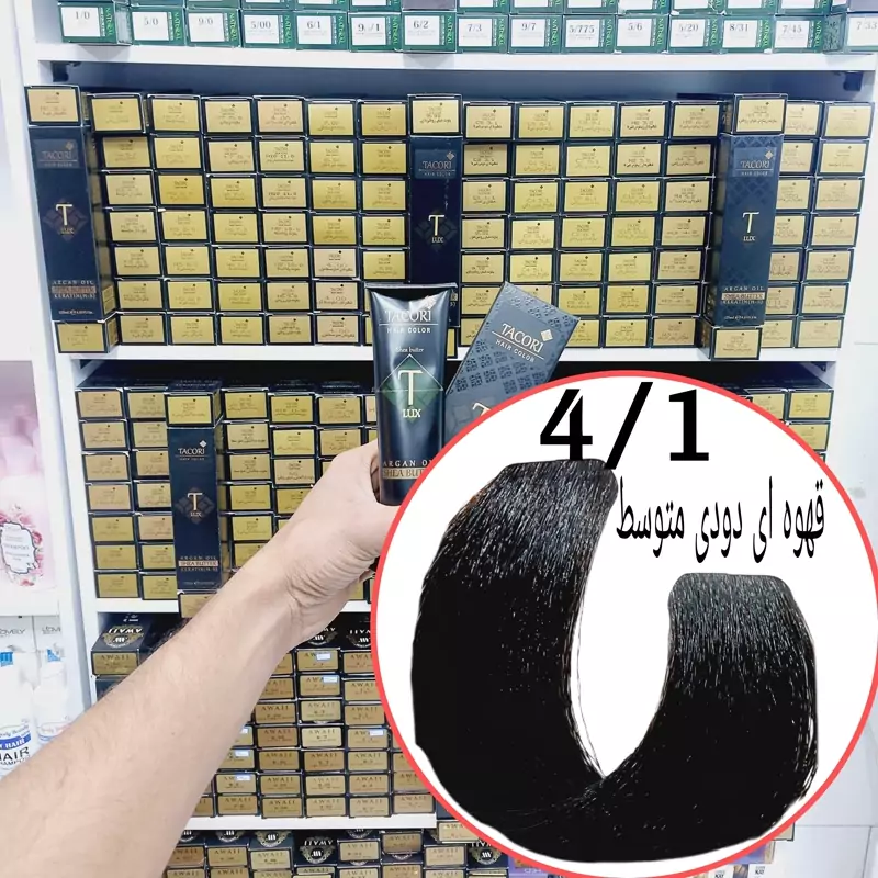 رنگ مو برندتاکوری قهوه ای دودی متوسط(4.1)حجم125میل حاوی شی باتر آرگان وکراتین