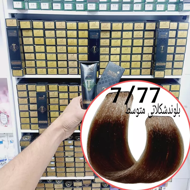 رنگ مو برندتاکوری بلوند شکلاتی متوسط (7.77) حجم125میل حاوی کراتین و آرگان و شی باتر