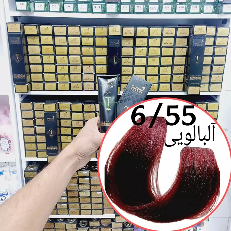 رنگ مو برندتاکوری آلبالویی تیره(5.55) حجم125میل حاوی کراتین و آرگان و شی باتر
