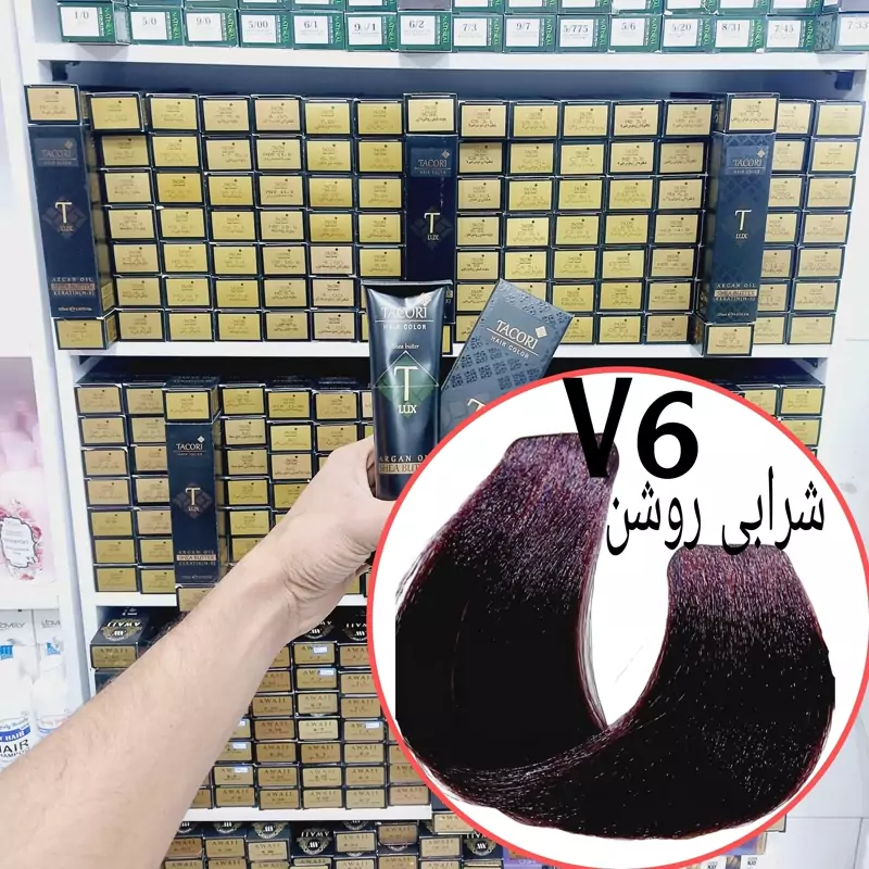 رنگ مو برندتاکوری شرابی روشن(v6) حجم125میل حاوی کراتین و آرگان و شی باتر