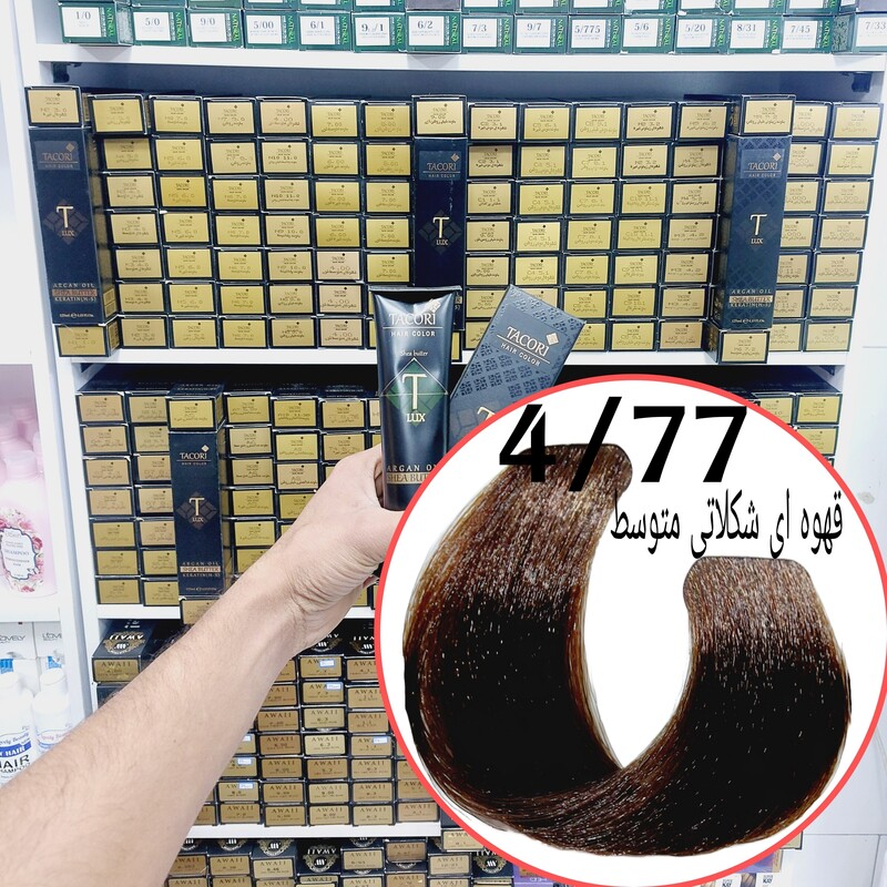 رنگ مو برندتاکوری قهوه ای شکلاتی متوسط (4.77) حجم125میل حاوی کراتین و آرگان و شی باتر
