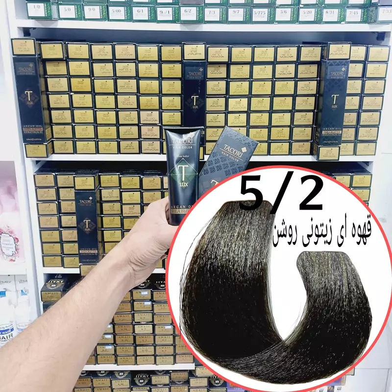 رنگ مو برندتاکوری قهوه ای زیتونی روشن (5.2)حجم125میل حاوی شی باتر آرگان وکراتین