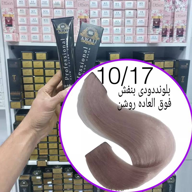 رنگ مو برند آوایی شماره( 10.17)بلوند دودی بنفش فوق العاده روشن حجم120میل حاوی کراتین و آرگان.ئاوایی.اوایی
