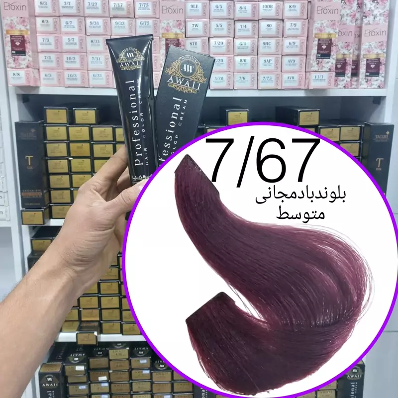 رنگ مو برند آوایی شماره(7.67) بلوند بادمجونی متوسط حجم120میل حاوی کراتین و آرگان.ئاوایی.اوایی