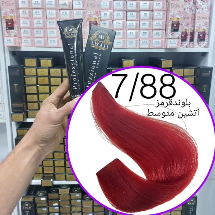 رنگ مو برند آوایی شماره(7.88) بلوند قرمز آتشین متوسطحجم120میل حاوی کراتین و آرگان.ئاوایی.اوایی