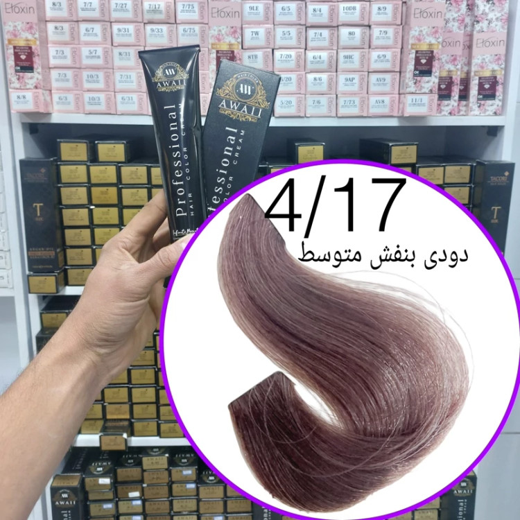 رنگ مو برند آوایی شماره( 4.17) دودی بنفش متوسط حجم120میل حاوی کراتین و آرگان.ئاوایی.اوایی