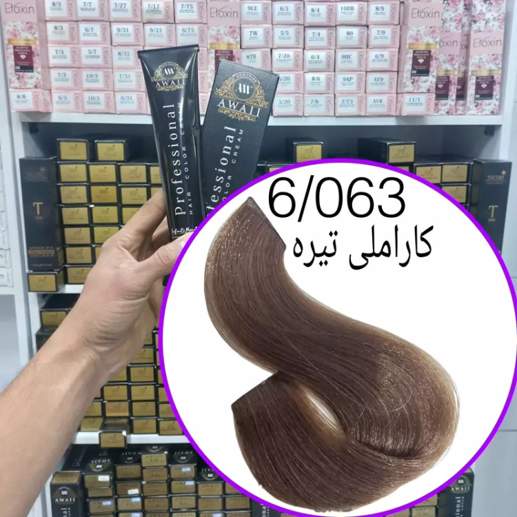 رنگ مو برند آوایی شماره(6.063)کارامل تیره حجم120میل حاوی کراتین و آرگان.ئاوایی.اوایی