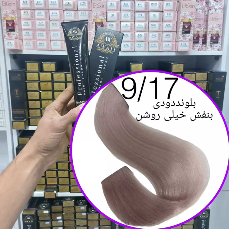 رنگ مو برند آوایی شماره( 9.17)بلوند دودی بنفش خیلی روشن حجم120میل حاوی کراتین و آرگان.ئاوایی.اوایی