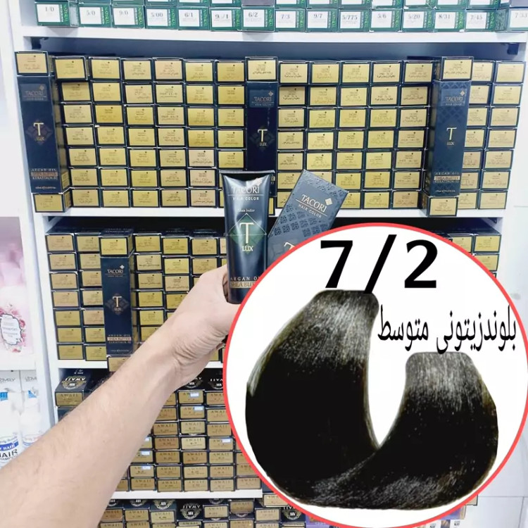 رنگ مو برندتاکوری بلوند زیتونی متوسط (7.2) حجم125میل حاوی شی باتر آرگان وکراتین