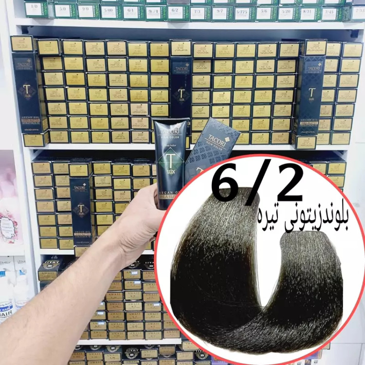 رنگ مو برندتاکوری بلوند زیتونی تیره (6.2) حجم125میل حاوی شی باتر آرگان وکراتین