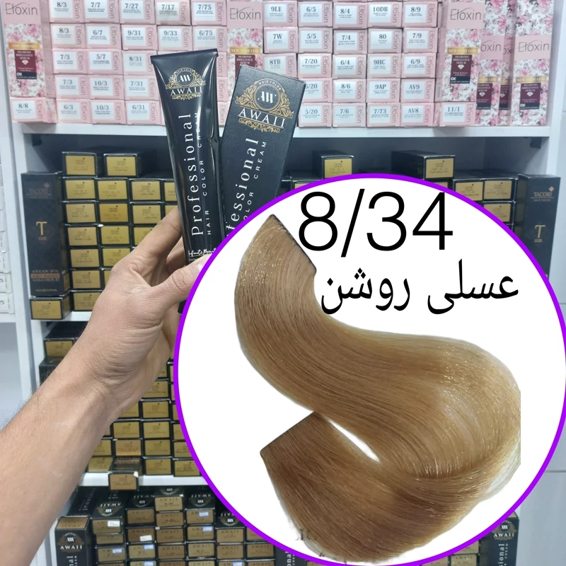 رنگ مو برند آوایی شماره(8.34)عسلی روشن حجم120میل حاوی کراتین و آرگان.ئاوایی.اوایی