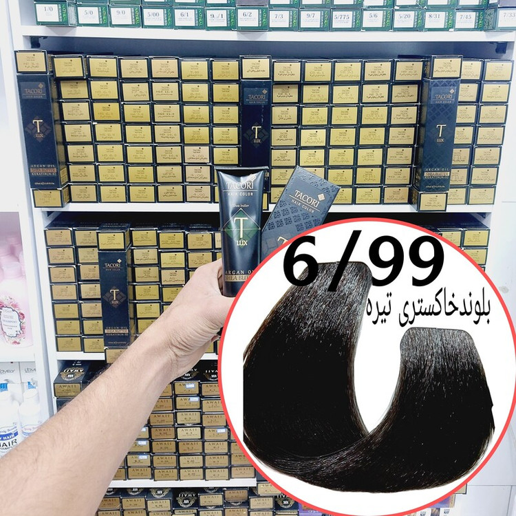 رنگ مو برندتاکوری بلوند خاکستری تیره(6.99) حجم125میل حاوی کراتین و آرگان و شی باتر