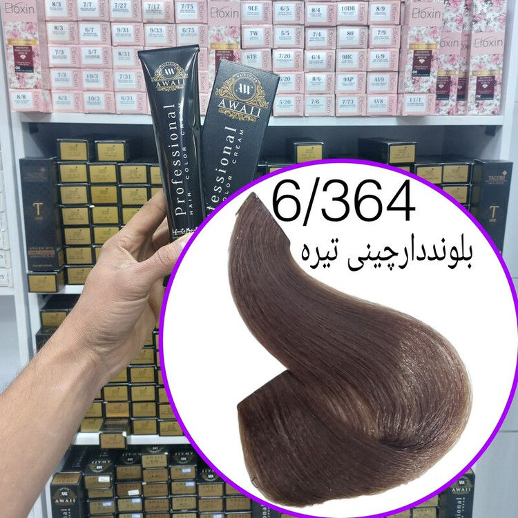 رنگ مو برند آوایی شماره(6.364)بلوند دارچینی تیره حجم120میل حاوی کراتین و آرگان.ئاوایی.اوایی