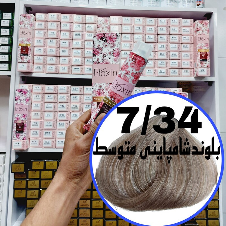 رنگ مو برند الوکسین بلوند شامپاینی متوسط (7.34) حجم120میل حاوی سرم الماس و برلیان