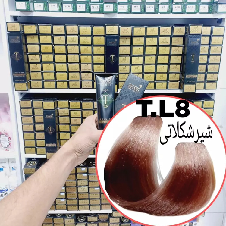 رنگ مو برندتاکوری شیر شکلاتی(T.L8) حجم125میل حاوی کراتین و آرگان و شی باتر