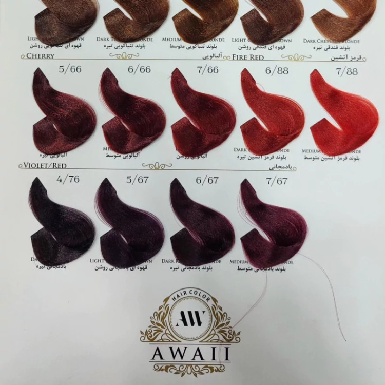 رنگ مو برند آوایی شماره(7.65)بلوند شکلاتی گرم متوسط حجم120میل حاوی کراتین و آرگان.ئاوایی.اوایی کپی