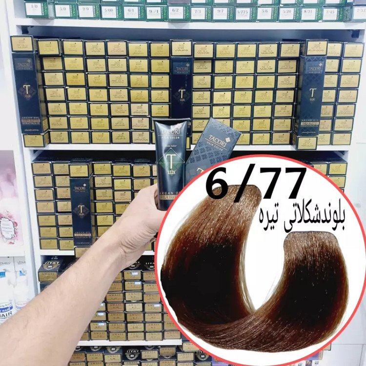 رنگ مو برندتاکوری بلوند شکلاتی تیره (6.77) حجم125میل حاوی کراتین و آرگان و شی باتر