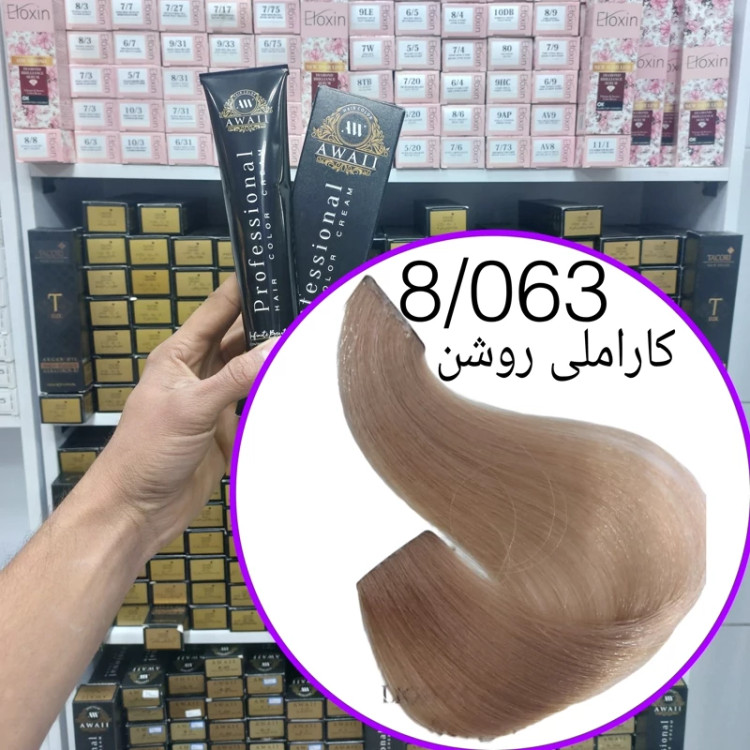 رنگ مو برند آوایی شماره(8.063)کارامل روشن حجم120میل حاوی کراتین و آرگان.ئاوایی.اوایی