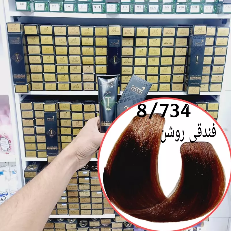 رنگ مو برندتاکوری فندقی روشن(8.734) حجم125میل حاوی کراتین و آرگان و شی باتر